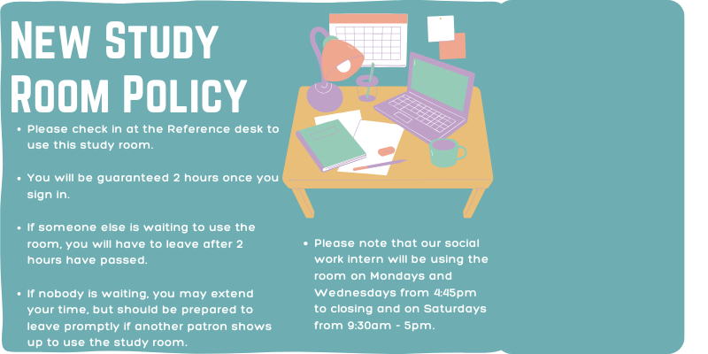 New study room policy! Please check in at the Reference desk to use this study room. You will be guaranteed 2 hours once you sign in. If someone else is waiting to use the room, yo